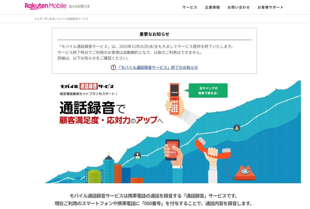 楽天モバイル(楽天コミュニケーションズ株式会社)が提供している「モバイル通話録音サービス」が、2025年12月31日をもって提供終了となることが正式に発表されました。